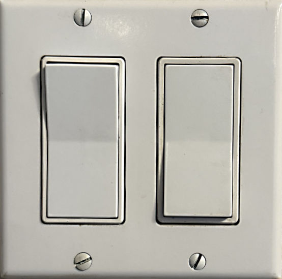 This is a pair of rocker light switches on the wall in our breakfast nook. Notice how one is down and the other is up (Or is it vice versa? Maybe I should say that one is on and the other is off. But that might not be totally accurate either. Uh oh…). I will go across the room or into the bedroom to find the other set of switches and turn one up or down (or on or off…yikes), so that I can return to these and put them both in the same position.